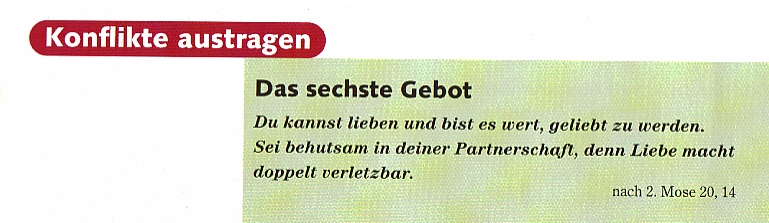 Auf Seite 22 im Kapitel 1 „Auf der Suche nach Partnerschaft und Liebe“ steht unter dem Unterkapitel „Konflikte austragen“ „Du kannst lieben und bist es wert geliebt zu werden. Sei behutsam in Deiner Partnerschaft, denn Liebe macht doppelt verletzbar.“ (Siehe Seitenausschnitt oben). Als Quelle wird angegeben "nach 2. Mose 20, 14". Wenn man in der Bibel nachschlägt findet man dort „Du sollst nicht ehebrechen.“, was allgemein das sechste Gebot genannt wird und auch die Überschrift zu dem obigen Text ist. Was hat diese Aussage noch mit dem Gebot zu tun? - werden wir das 5. Gebot „Du sollst nicht töten.“ in der nächsten Auflage vorgetragen bekommen mit: „Du hast das recht dich frei zu entfalten. Wenn du jemanden aus dem Weg räumst, achte darauf, daß du keine Spuren hinterläßt, sonst könnte es eng für dich werden.“ ???
